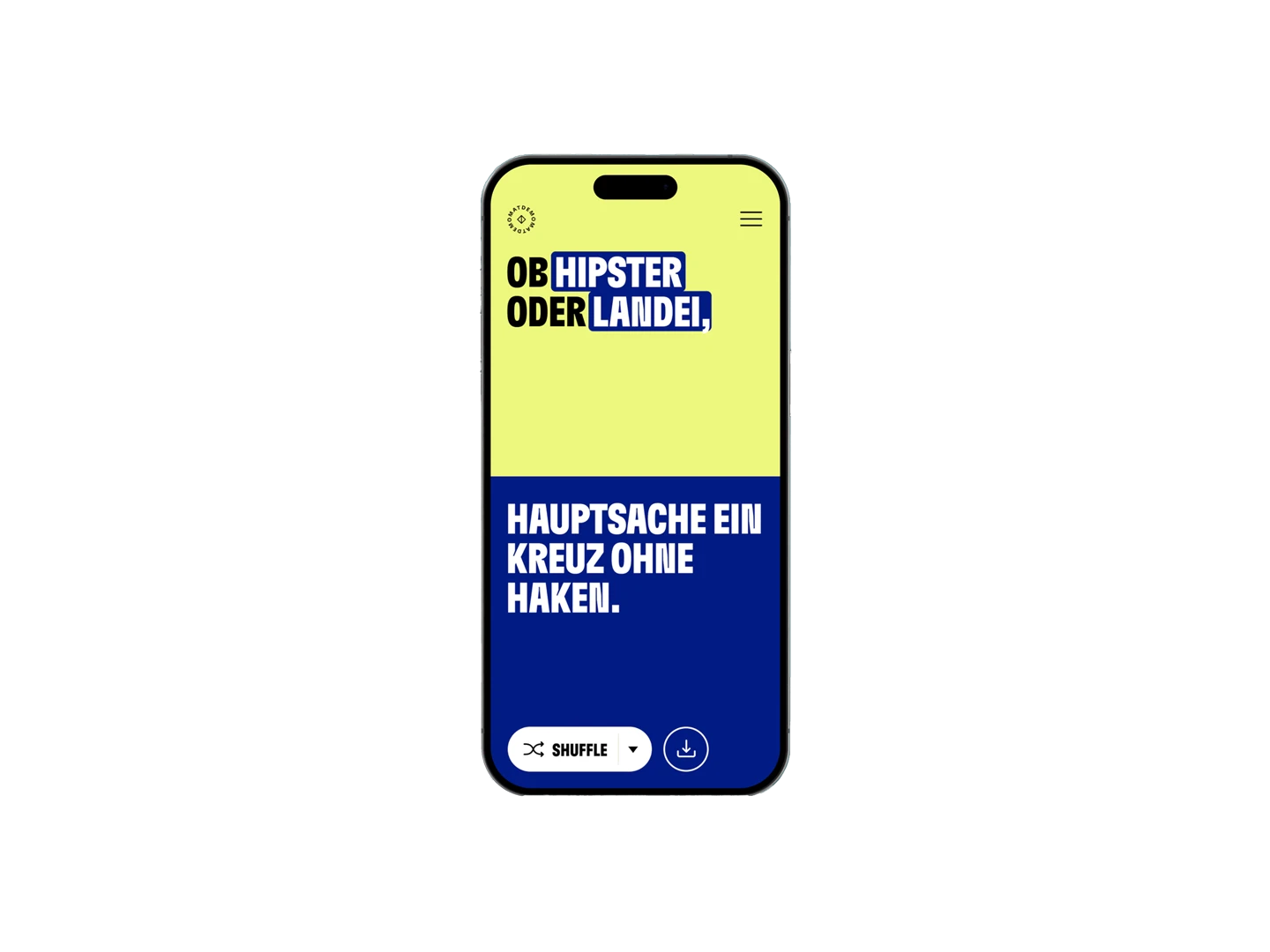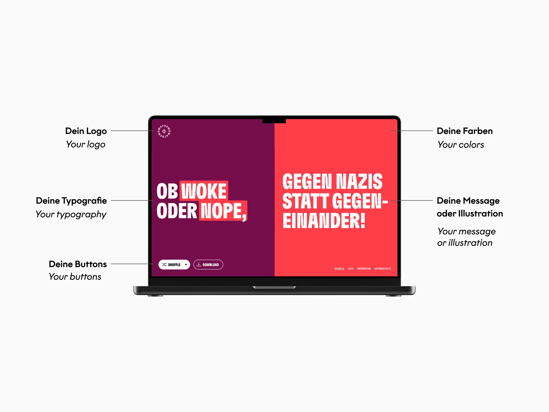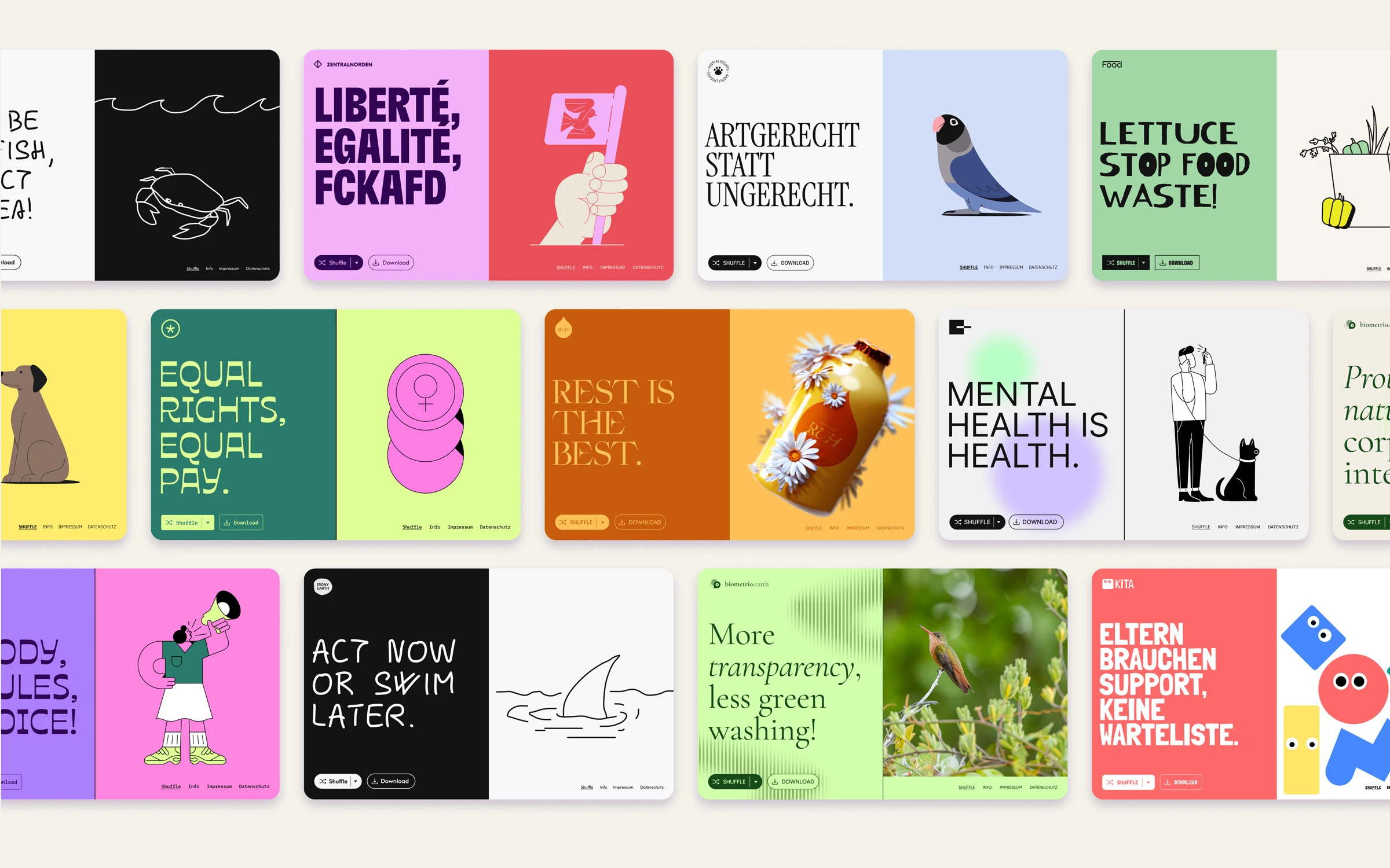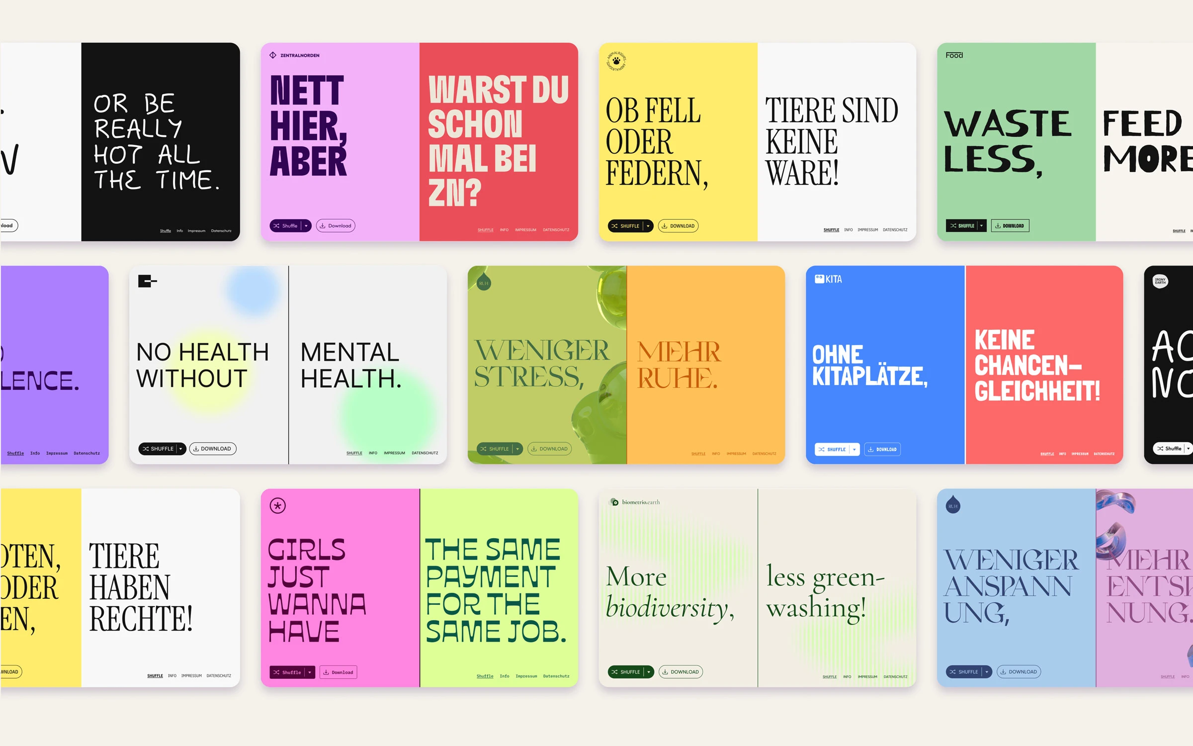Deine Marke? Deine Message! Lass Nutzer:innen inspirierende Inhalte wie Claims oder Illustrationen ershufflen und individuell zusammenstellen. Ob du für eine gute Sache werben, auf eine Gesetzesänderung hinweisen, oder deine Marke stärken möchtest: Der IMPACT-O-MAT ist so individuell wie deine Marke selbst. Und was ist deine Vision?