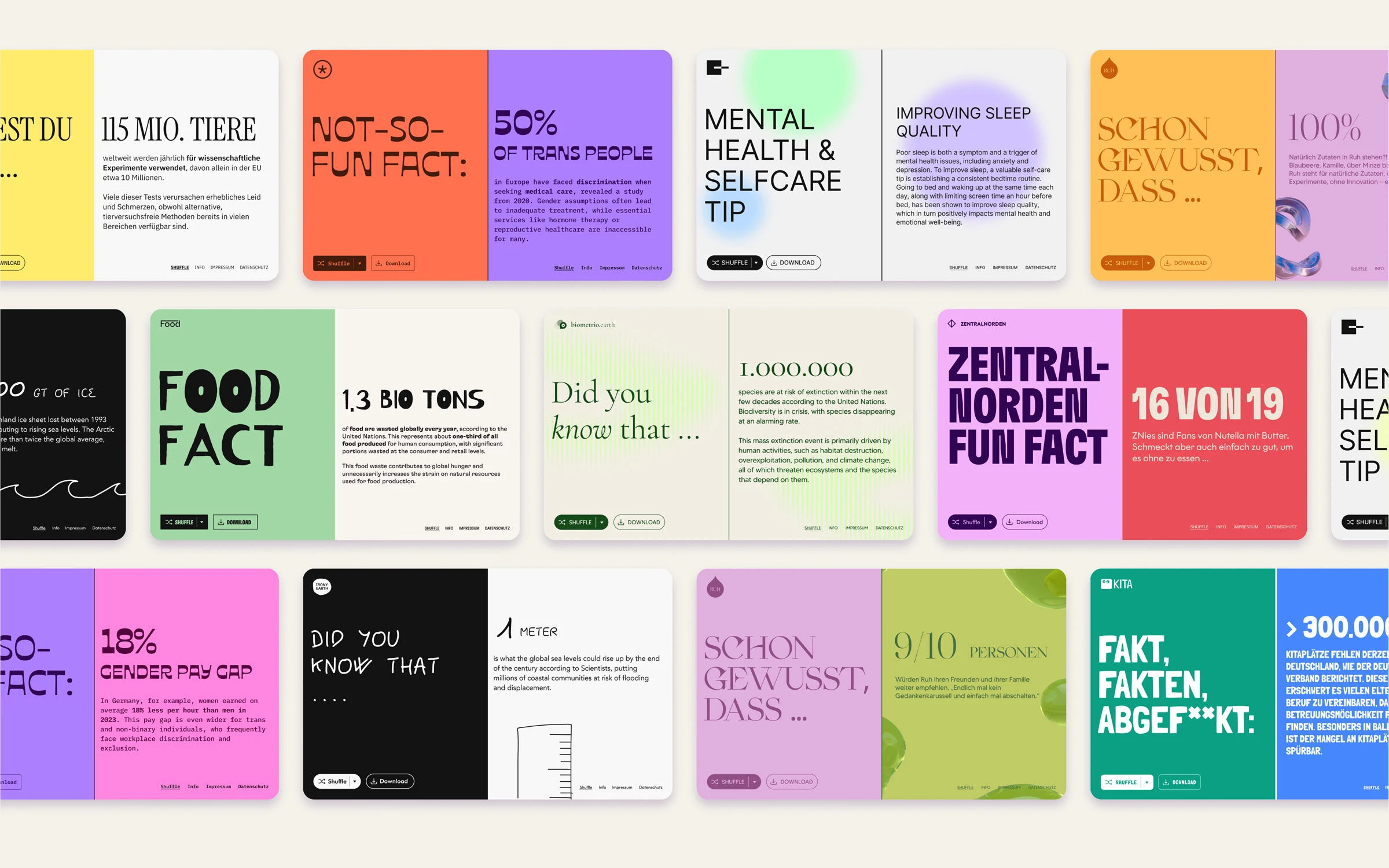 Der IMPACT-O-MAT bietet dir die ideale Basis für deine Kampagne. Der Clou: Durch White Labeling lässt sich das Design vollständig an dein Corporate Design anpassen. Wir integrieren dein Logo, deine Typografie und Farbwelt, und du entscheidest, ob User nur Claims oder auch Illustrationen shufflen können. Du möchtest lieber Aufklärung leisten? Dann ist unser “Fact Generator” genau das Richtige für dich: Nutzer:innen können sich durch eine Vielzahl spannender Fakten klicken und dabei spielerisch neues Wissen entdecken. Drei Use Cases, unendlich viele Möglichkeiten!