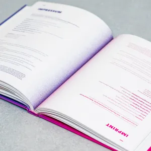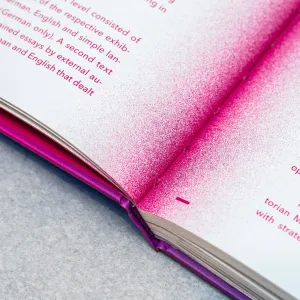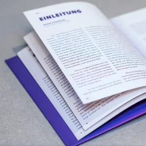 Our task was to transfer the design of the exhibition to the booklet. At the same time, it needed to have an independent character that would function independently of and beyond the exhibition. The contributions were to be illustrated in German and English, with both languages being equally important and at the same time clearly differentiated from each other.